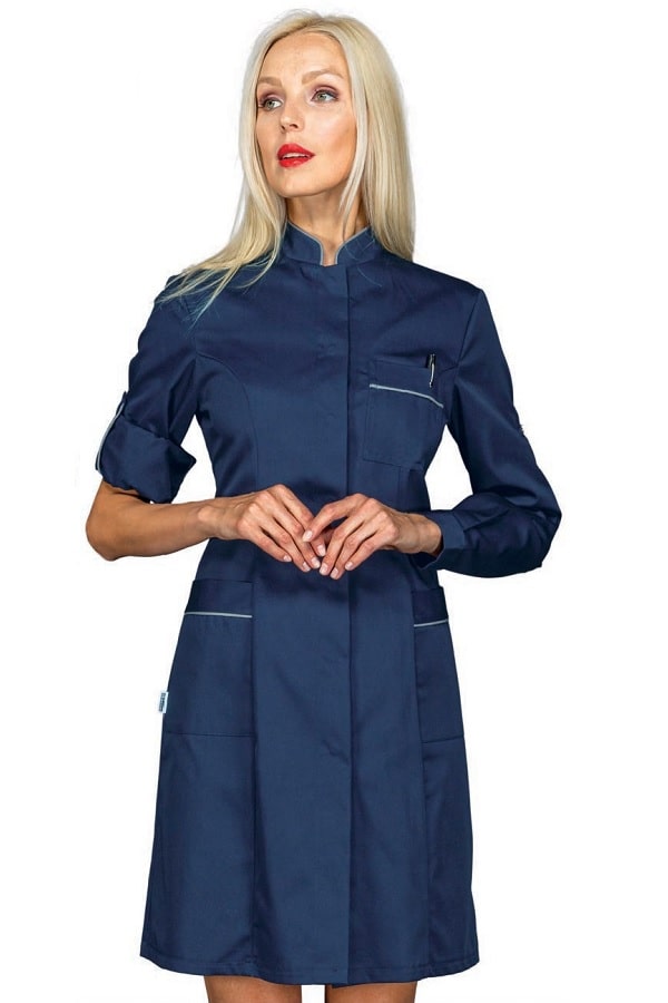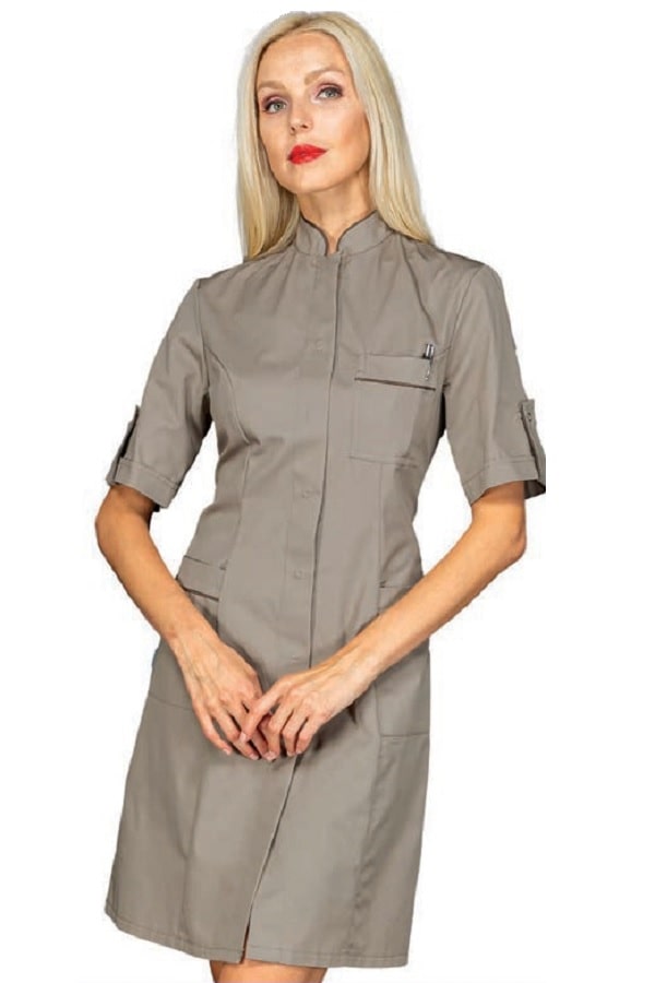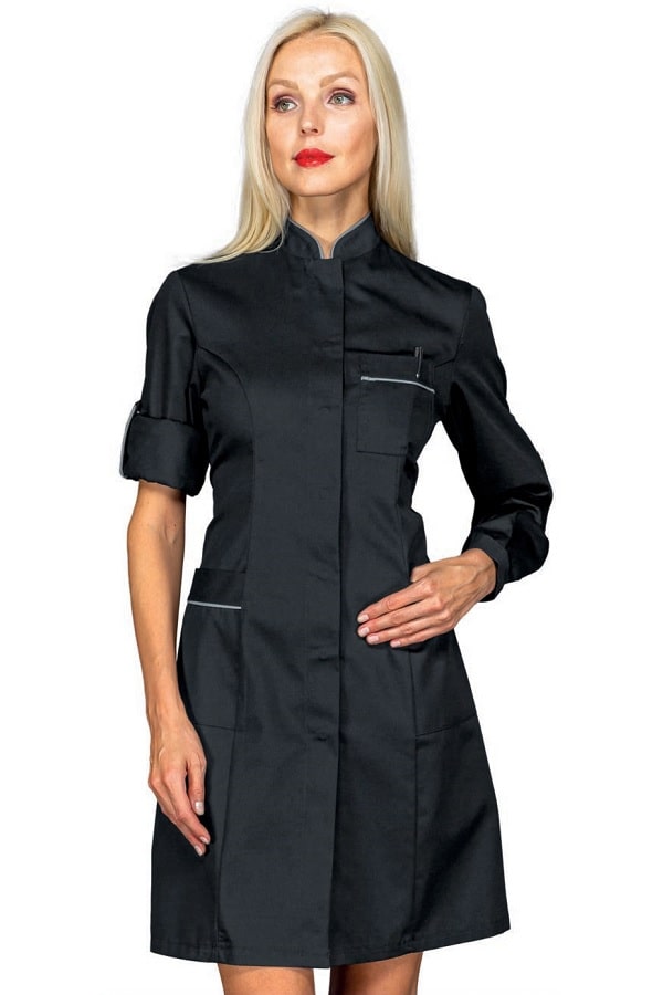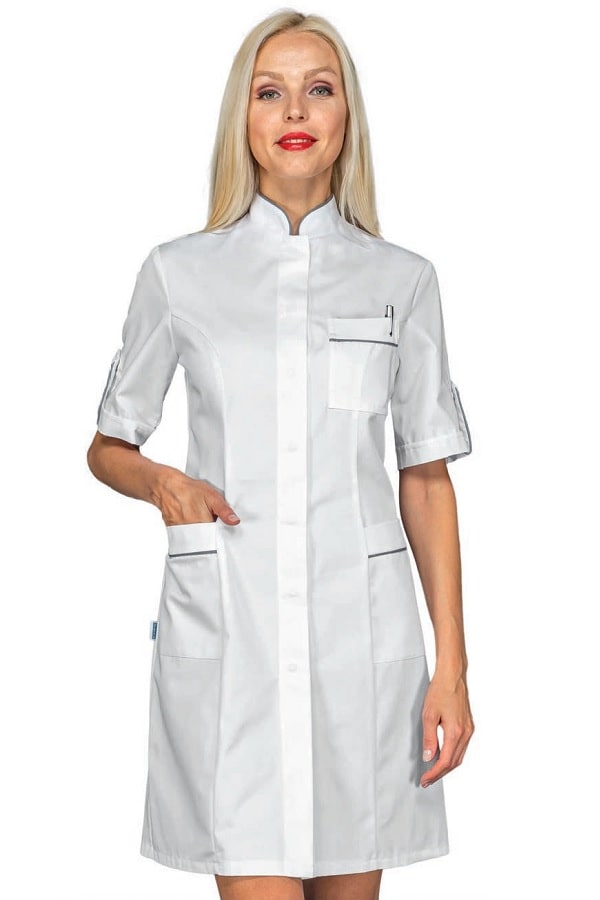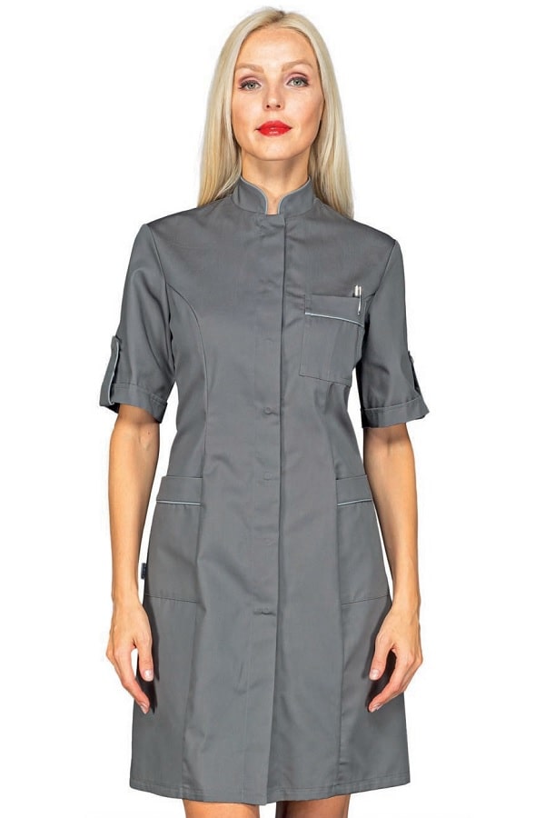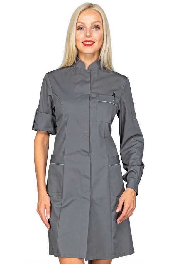 Camice dalla linea slim sfiancato ed elegantissimo con delle caratteristiche che lo rendono unico. Il disegno con un colletto leggero e bordato Grigio alla coreana. Scende verso l'apertura centrale invisibile con apertura bottoni a pressione. La linea si stringe in vita e si allarga seguendo i fianchi con degli spacchetti alle estremità. Dotato anche di 2 comode tasche laterali. E' un camice Raffinato per tutti gli ambienti lavorativi dove deve essere risaltata l'eleganza. Ideale come camice per farmacista o camice dottoressa.
