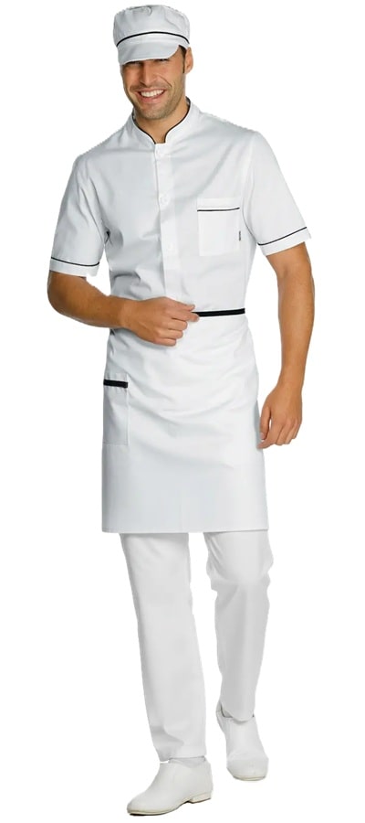 Giacca bianca a maniche corte in tessuto leggero di cotone, dal collo simmetrico. Profili a contrasto. Chiusura classica con bottoni piatti tondi in asole. Una giacca leggerissima che non si stira facilmente ideale per pizzerie e cucine
