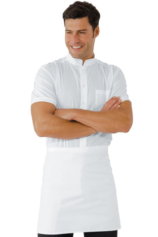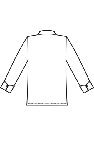 Giacca classica bianca a maniche lunghe in tessuto cotone doppio ritorto. Con collo simmetrico. Chiusura centrale antipanico con bottoni classici a pallina estraibili.