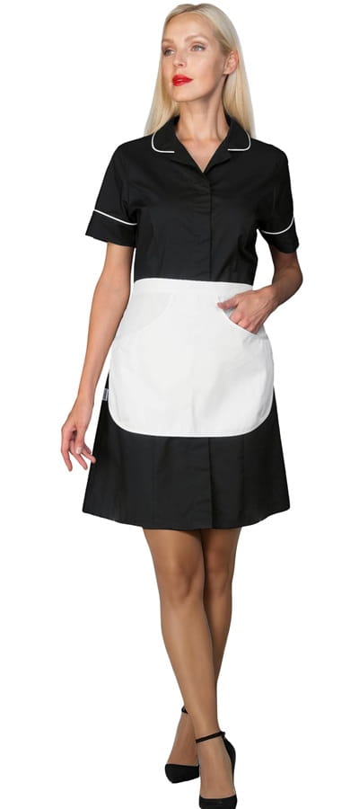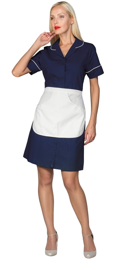 Camice Donna realizzato in un tessuto leggero di misto cotone con colori brillanti. Si caratterizza da eleganti linee e profili bianchi su collo, maniche e tasche. Fornito in abbinamento al grembiulino Isacco Manila Bianco.