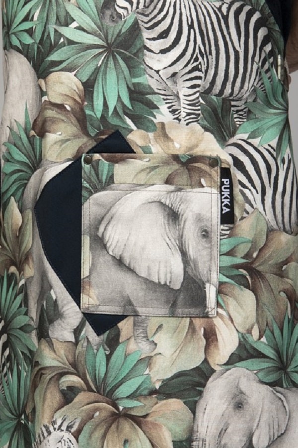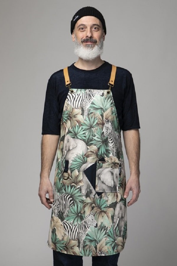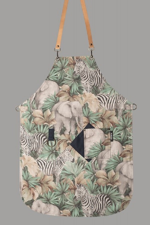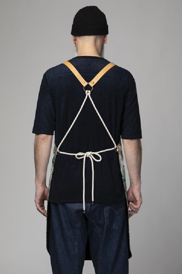 il grembiule viene lavato a 30 ° C in un programma di centrifuga leggera e stirato. Le cinghie di cuoio devono essere rimosse durante il lavaggio.