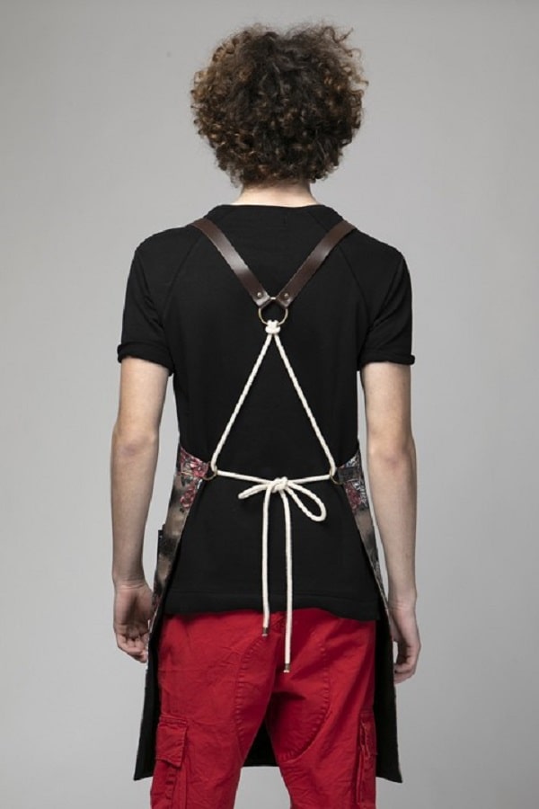 Grembiule in tessuto gabardine stampato. Ha una tasca funzionale a due scomparti di diverse dimensioni a seconda delle esigenze (pda, denaro, portamonete, apribottiglie) e una piccola tasca sul petto.