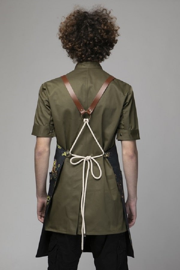 il grembiule viene lavato a 30 ° C in un programma di centrifuga leggera e stirato. Le cinghie di cuoio devono essere rimosse durante il lavaggio.
