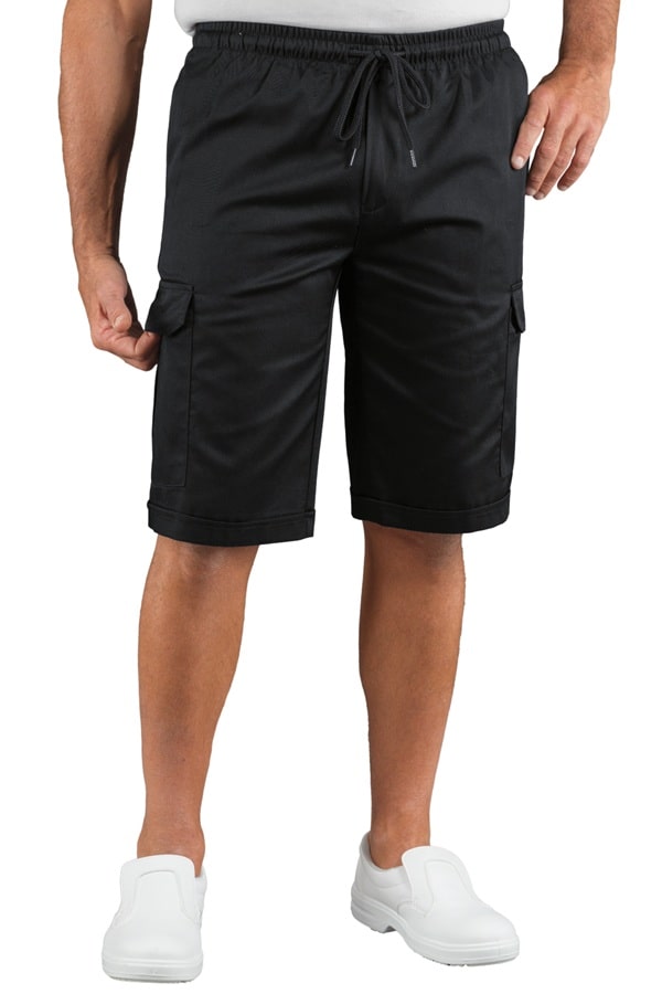 Corti, Con ampio elastico rinforzato da una doppia cucitura. in vita e fettuccia di chiusura. Sono provvisti di 5 tasche: 2 anteriori alla francese, 1 posteriore destra e 2 ampie tasche laterali gamba con chiusura ad aletta. Particolarmente indicati per laboratori e cucina ma versatili anche per molti altri contesti di lavoro.