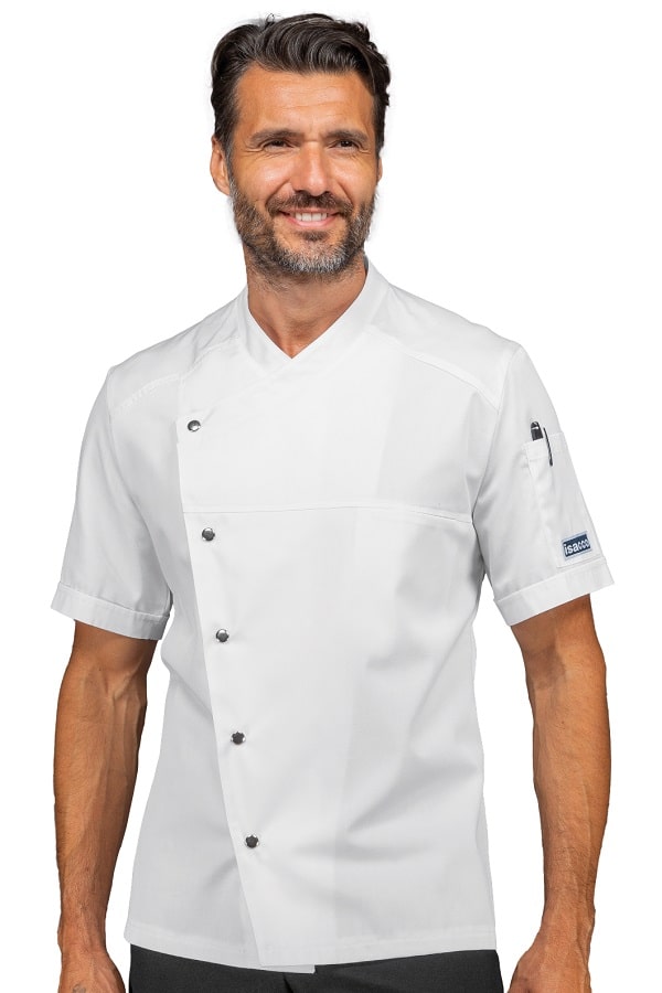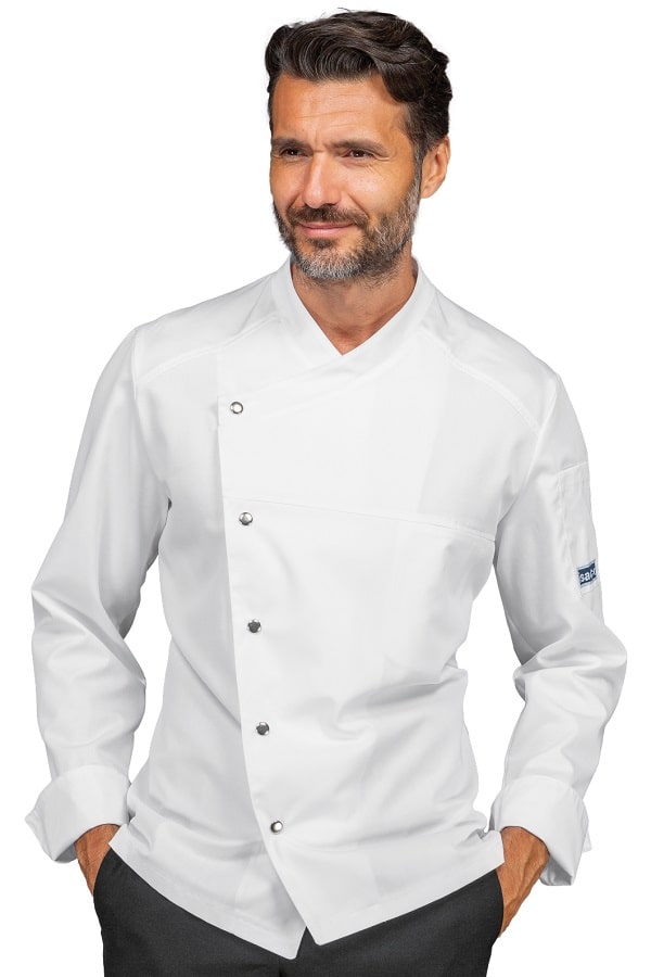 Giacca da cuoco moderna con vestibilità slim ed apertura laterale con bottoni a pressione metallici. Leggera e traspirante si contraddistingue per il la linea moderna con apertura diagonale automatica e ampia fascia microforata posta a centro schiena.
