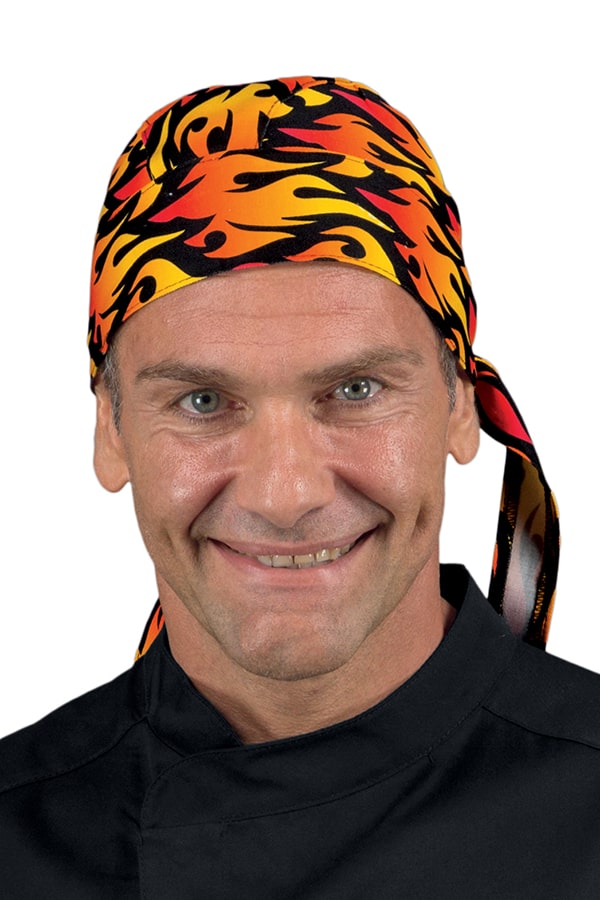 Copricapo bandana con fettuccia di raccordo per chiusura posteriore regolabile a nodo.