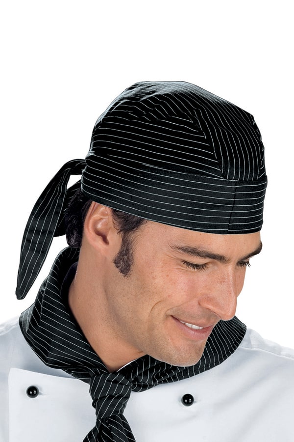 Copricapo bandana con fettuccia di raccordo per chiusura posteriore regolabile a nodo.