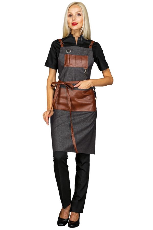 Grembiule pettorina con cintura elegante e pratico. Dotato di ampia tasca centrale in cuoio e tasca a 4 scomparti sulla pettorina con gancio, inserti in cuoio e fibie di rinforzo in cuoio. Lungo oltre le ginocchia in versione one size. Si indossa con pratiche fibie ad incrocio dietro la schiena per un uso leggero e non affaticante.