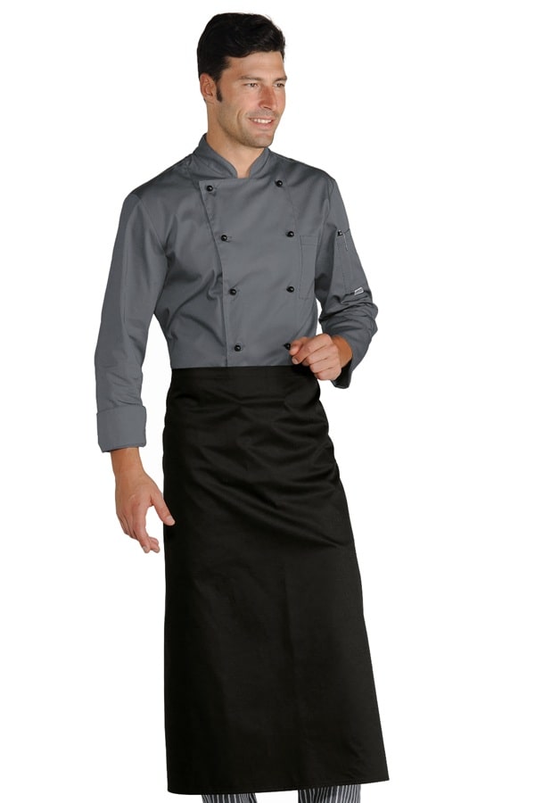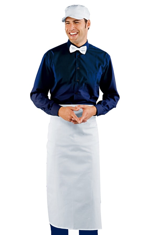 Grembiule senza tasche. Molto lungo e avvolgente. Ha una fettuccia sottile e lunga. Lungo fino quasi alle caviglie è realizzato o in tessuto nero misto cotone o in 100% Cotone robusto bianco