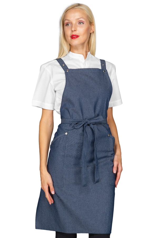 Realizzato nel 100% Cotone jeans. La fettuccia, ad incrocio dietro la schiena, lo rende particolarmente confortevole. E' regolabile con comodi bottoni metallici a pressione.Davvero bello ed elegante in 4 versioni di tessuto e colore