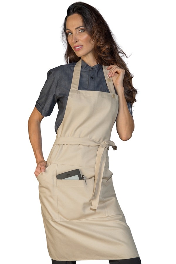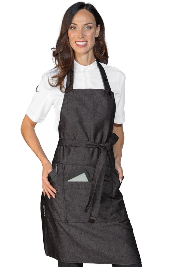Grembiule pettorina regolabile, con 2 tasche sui lati e tascone centrale porta tablet. Molto pratico per blocchetti e comande, ordini, penne, tablet e cassa. Ha una fettuccia spessa e lunga. E' Lungo fino a metà gamba ed è realizzato in tessuto strong di 65% Cotone, molto resistente.