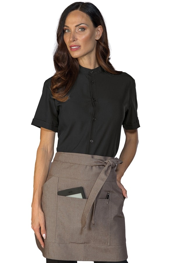 Grembiule con 2 tasche sui lati e tascone centrale porta tablet. Molto pratico per blocchetti e comande, ordini, penne, tablet e cassa. Ha una fettuccia spessa e lunga. E' Lungo fino a mezza gamba ed è realizzato in un tessuto strong in 65% Cotone resistente