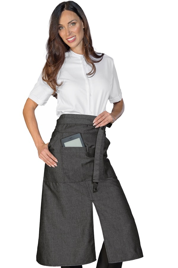 Grembiule con 2 tasche sui lati e tascone centrale porta tablet. Molto pratico per blocchetti e comande, ordini, penne, tablet e cassa. Ha una fettuccia spessa e lunga. E' Lungo fino quasi alle caviglie ed è realizzato in un tessuto strong in 65% Cotone resistente