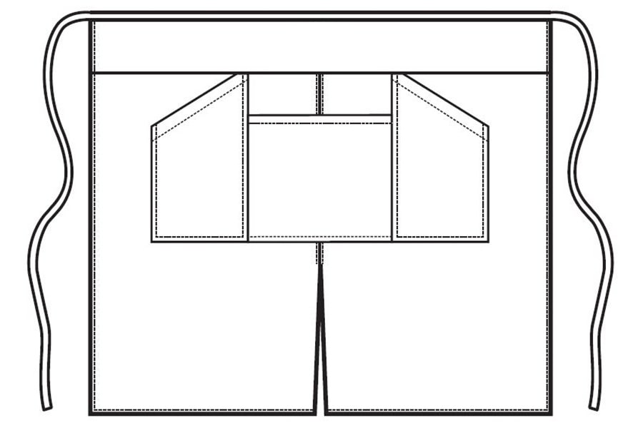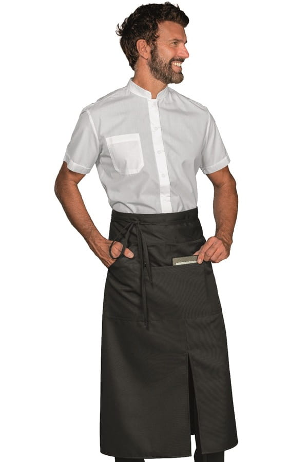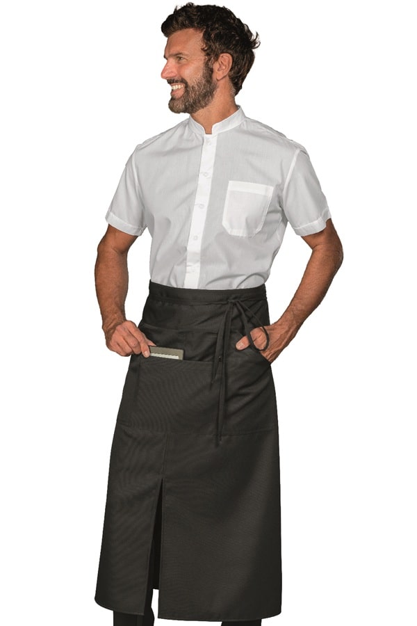 Grembile con 2 tasca sui lati con apertura diagonale ed una ampia tasca centrale porta tablet. Molto pratiche per blocchetti e comande, ordini, penne, tablet e cassa. Ha una fettuccia sottile e lunga. Lungo fino quasi alle caviglie è realizzato in tessuto 100% Polyestere, Stirofacile e resistente