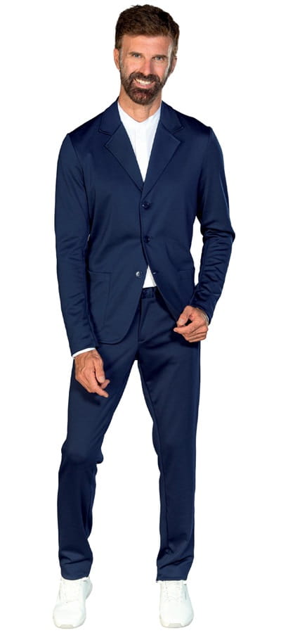 Giacca moderna e sfiancata da uomo comoda con apertura a 3 bottoni. Realizzata in un tessuto innovativo, morbido, elasticizzato, sintetico, resistente e stiro facile. E' pratica perché si piega come una felpa. Concepita per utilizzi continuativi in ambiti di rappresentanza e reception. Stile moderno e sfiancato con 2 tasche.
