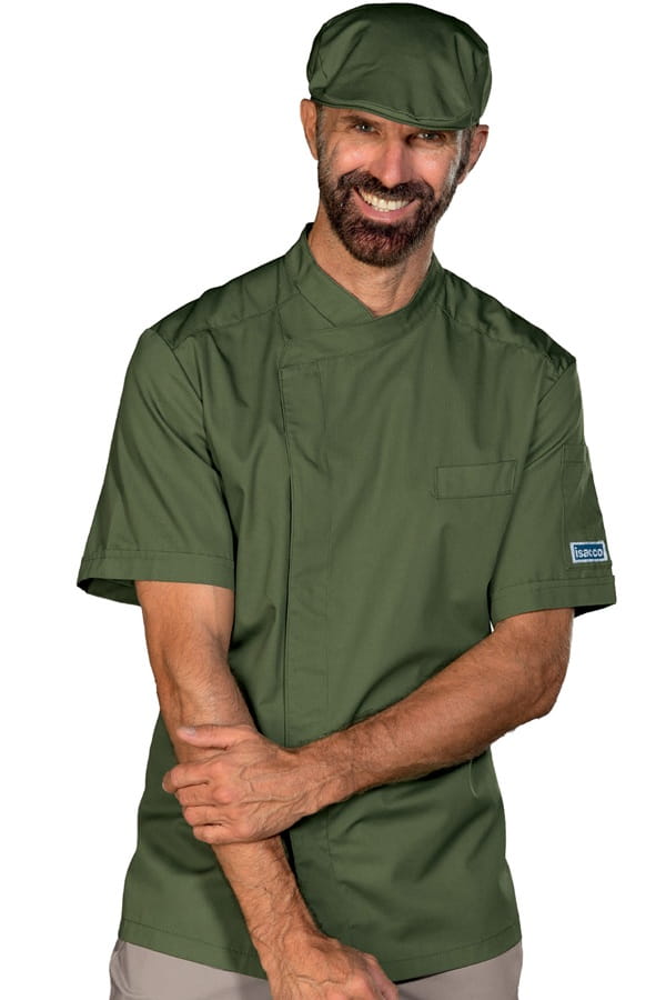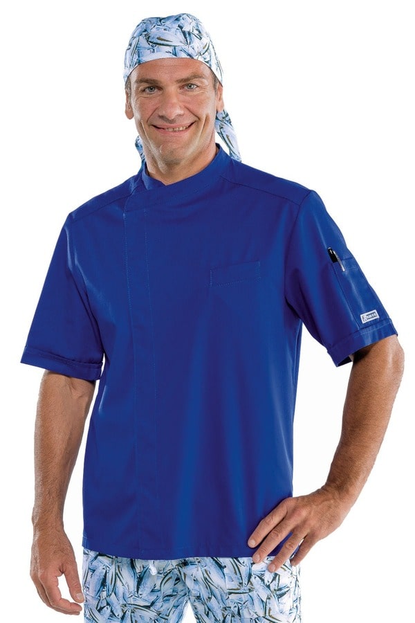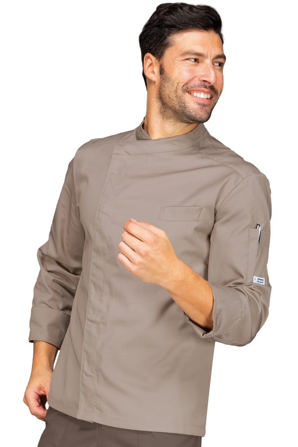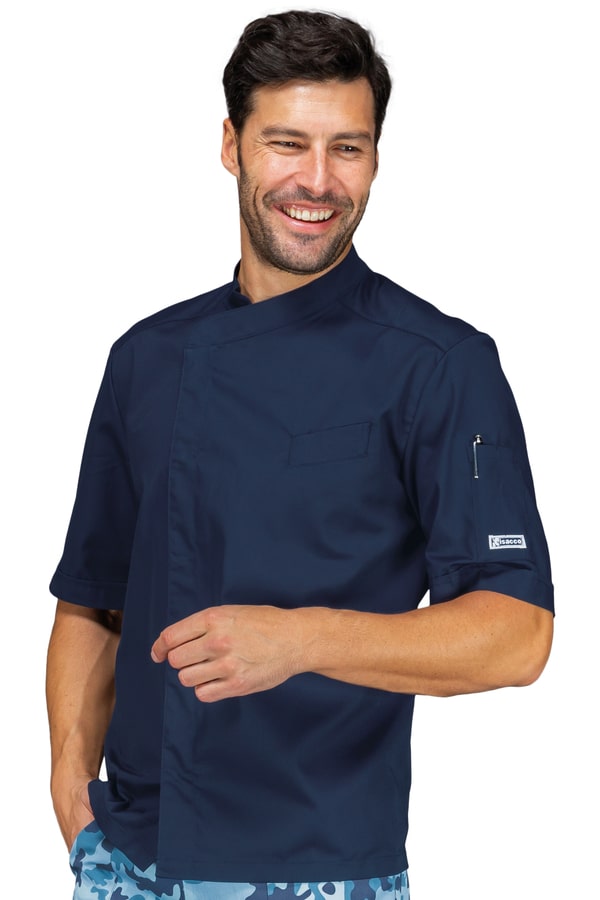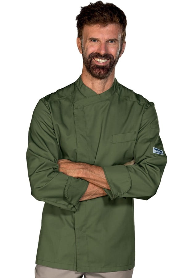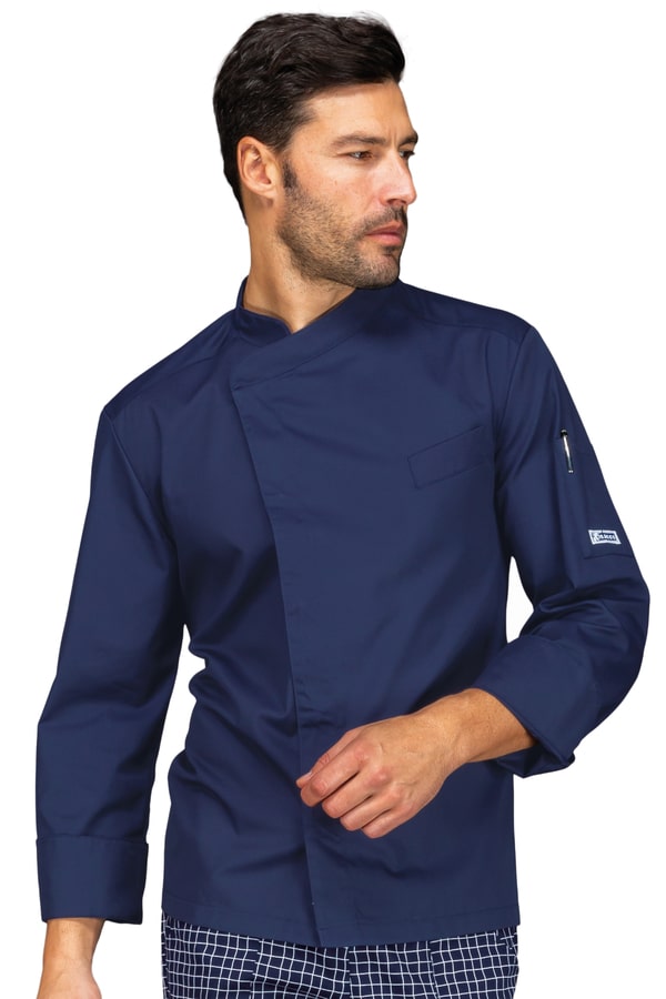 Giacca con collo asimmetrico rifinito con bordino in tinta. Chiusura leggermente laterale con bottoni a pressione nascosti. Una giacca leggera e stiro facile. Realizzata in diversi colori.