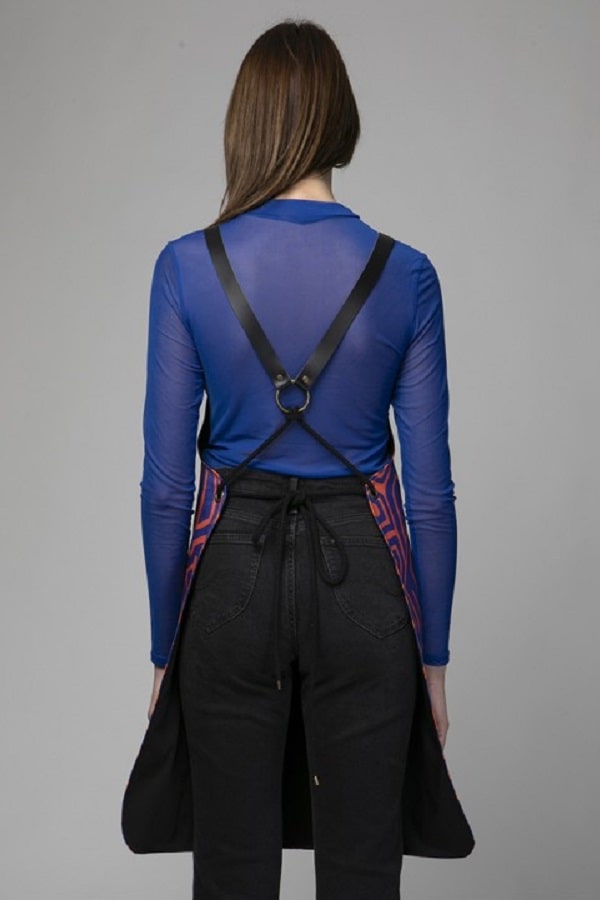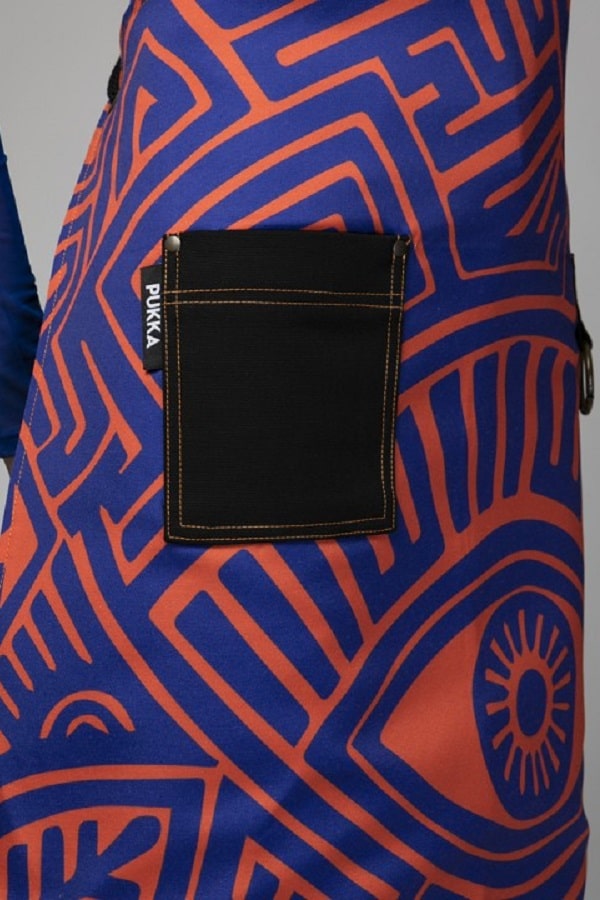 Grembiule in tessuto di tela blue e rosso vivo, fantasia particolare artistica con simboli maori. Presenta una tasca all'altezza delle gambe sul fianco destro ed un gancio con anello sul fianco opposto.