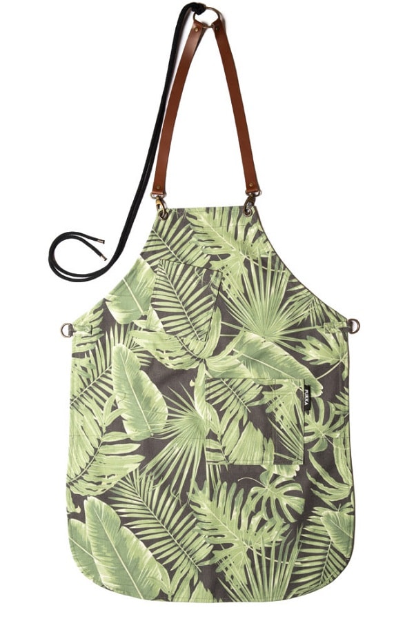 Grembiule in tessuto di tela rifinita, fantasia foglie verdi. Presenta una tasca all'altezza delle gambe con tramezzi e una sul petto.