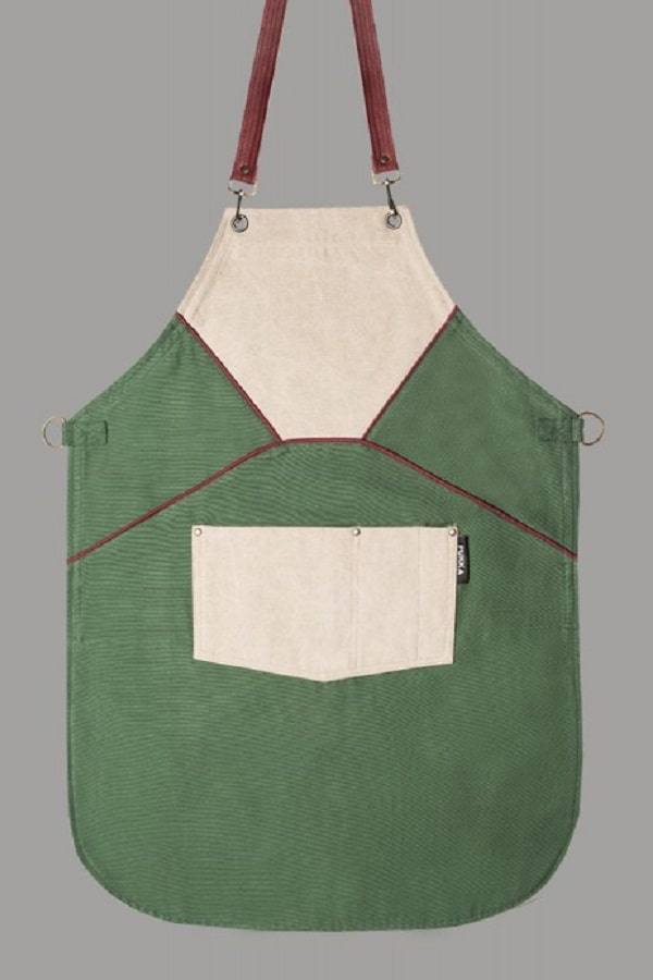 Grembiule in tessuto di tela verde, bordini bordeaux, con simmetrie. Presenta una grande tasca centrale a tre scomparti.