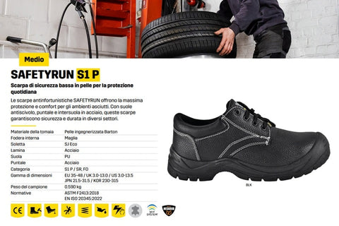 Le scarpe antinfortunistiche SAFETYRUN S1 rappresentano la soluzione ideale per chi lavora in ambienti asciutti e richiede protezione senza compromessi. Dotate di certificazione S1P, combinano una punta rinforzata e un'intersuola in acciaio per una difesa completa contro i rischi. La suola antiscivolo garantisce stabilità su qualsiasi superficie, mentre la tecnologia antistatica protegge da cariche elettriche e scintille. Il plantare regolabile consente una personalizzazione della larghezza per il massimo comfort durante le lunghe giornate lavorative. Traspiranti e leggere, mantengono i piedi freschi e asciutti. Affidabili in automotive, logistica, edilizia, mineraria e oil & gas, offrono protezione professionale a un prezzo competitivo