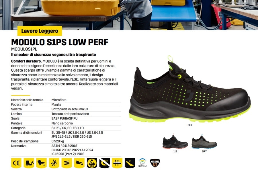 Scopri il comfort senza compromessi con MODULO S1PS Low Perf, la scarpa di sicurezza che unisce prestazioni e durabilità. Progettata per professionisti esigenti, offre resistenza allo scivolamento certificata, design traspirante per il benessere dei piedi durante le lunghe giornate lavorative, e plantare ergonomico con protezione ESD. L'intersuola leggera riduce l'affaticamento, mentre il puntale di sicurezza garantisce protezione totale. Realizzata con materiali vegani e dotata di suola in PU BASF ad alta resistenza all'abrasione, questa scarpa assicura longevità eccezionale. La scelta ideale per chi non scende a compromessi sulla qualità .